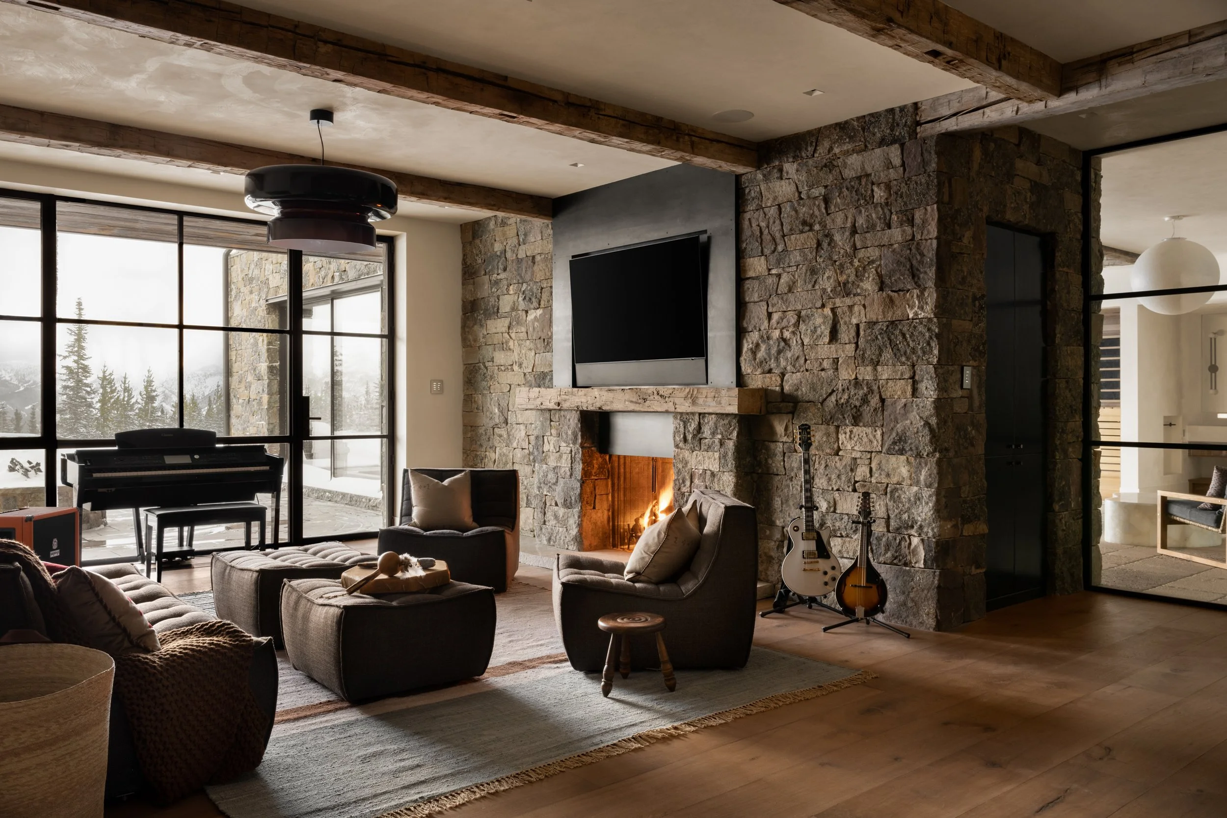 Designed as a year-round mountain retreat, the residence blends the warmth of a traditional cabin with the conveniences of modern living. It features an indoor pool, golf simulator, theater, shaded sunroom, wine cellar, and an array of hidden technologies, all engineered to disappear into the architecture.